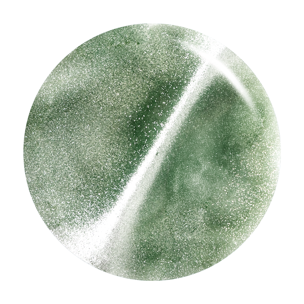 Sage green. Medium-dark. Silver magnetic shimmer. Opaque. Cool undertone.